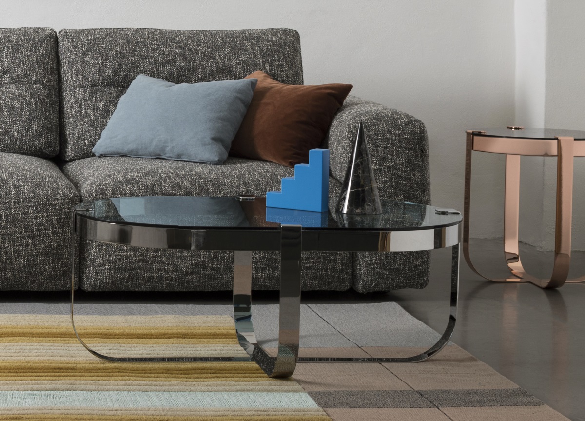 Confalonieri has chosen specific materials aimed to emphasise her inspiration behind the collection. So, as in jewellery design, the glass tops in either; smoked or transparent glass are literally set into the base structure.