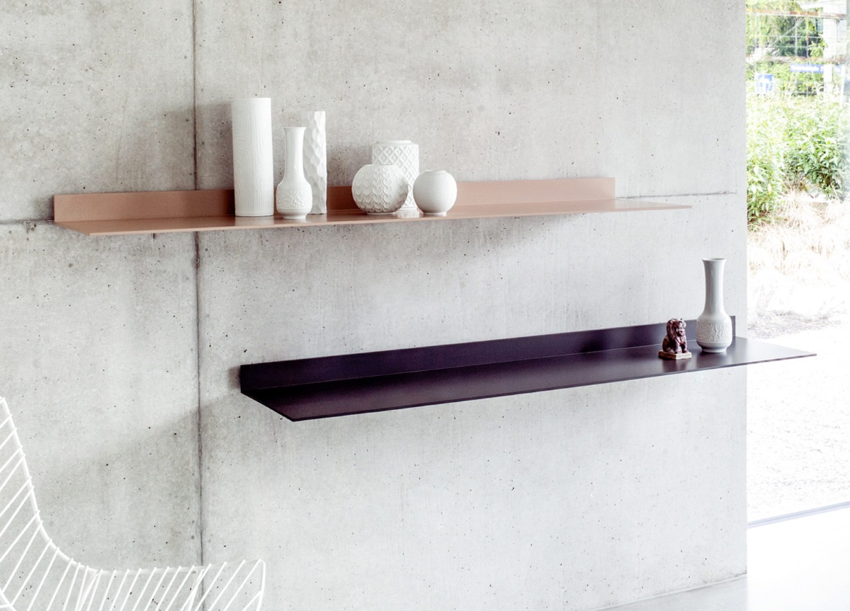 Each 7mm thick solid aluminium S7 shelf is angled upwards at the wall and attached to a matching, concealed wall mounting, so that the shelf appears to hang clear of the wall. Shelf angles can be varied by a few millimetres using an adjusting screw.