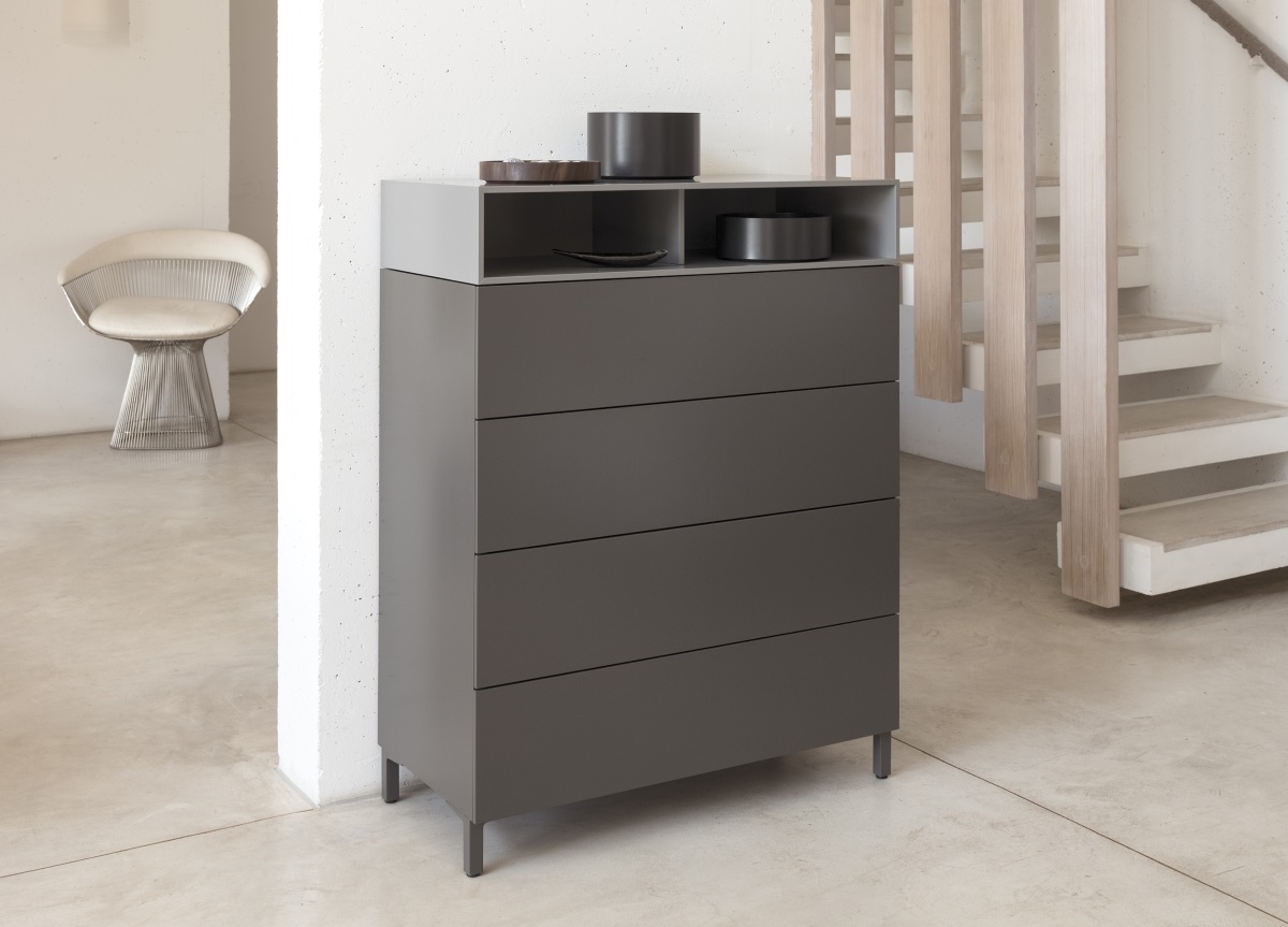 This 4 drawer chest can be chosen in a fantastic selection of modern matt lacquer colours, including soft pastels. An optional open element can be placed on top of the chest and painted in the same, or a contrasting colour.