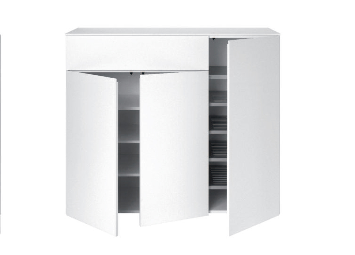 Painted in fresh Snow White, this contemporary sideboard has three doors and one drawer (as seen in the main picture), however, it can also be selected without the drawer. Internally, it is available with loose shelves, or ultra practical shoe racks, and we have priced for both options.