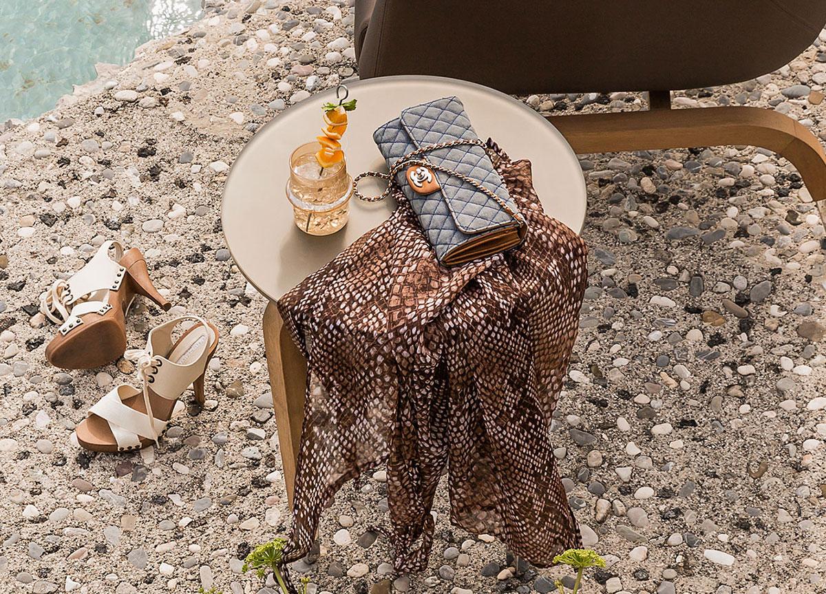 The Tahiti side table is beautifully made in a high quality teak, with polished steel details, that is weather and water durable. It is available in three sizes with a choice for the top - bronzed glass, ceramic or granite.