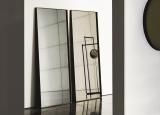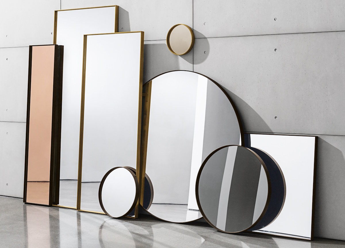 Each size can be hung vertically or horizontally and can be selected with an extralight clear, smoked, bronzed, rose, or gold mirrored glass finish. The surrounding lacquered aluminium frame is available in either mocha, black, or a burnished brass metal finish.