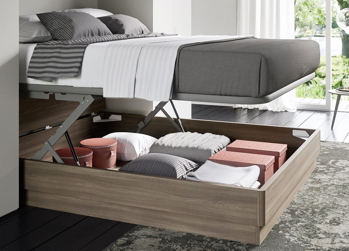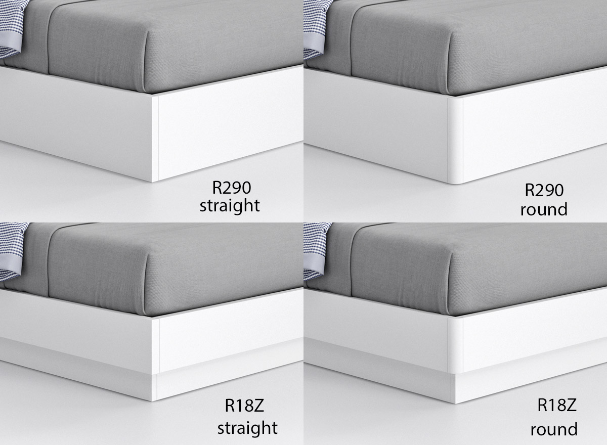Theres two designs for the base - with either straight or rounded corners, & two types of storage slat mechanisms - standard storage slats which lift up from one end, & Pratic storage slats (shown), which lift the whole mattress support up, making the space underneath much more accessible.