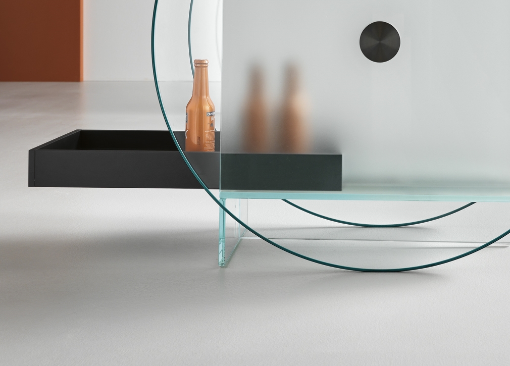 For extra strength all the glass used for Kart has been tempered and is a sturdy 12mm thick. The smart black matt lacquered wood tray at the bottom pulls out for ease of use and is the perfect place to store bottles and glasses.