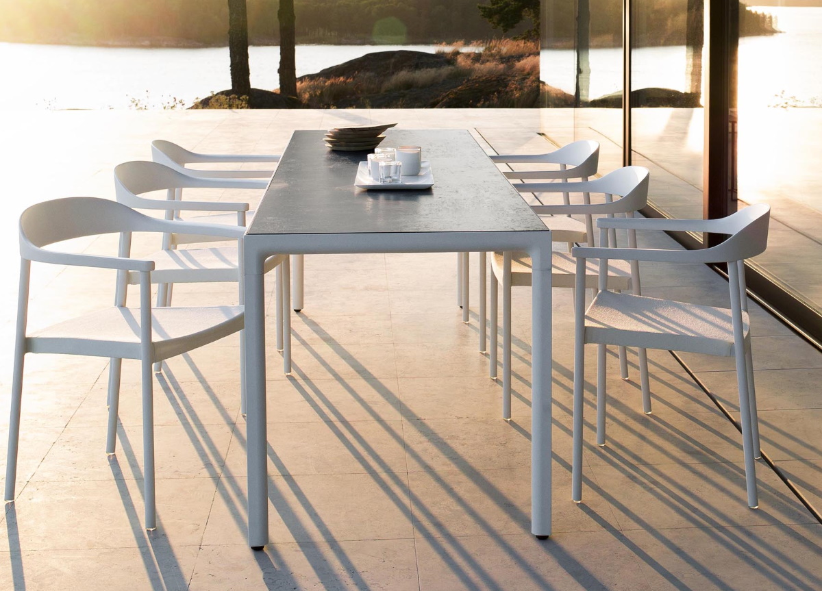 The slim version of the Illum garden dining table is perfect for smaller spaces, balconies or patios as it is just 71cm wide. Made in Belgium by Tribu, experts in contemporary garden furniture.
