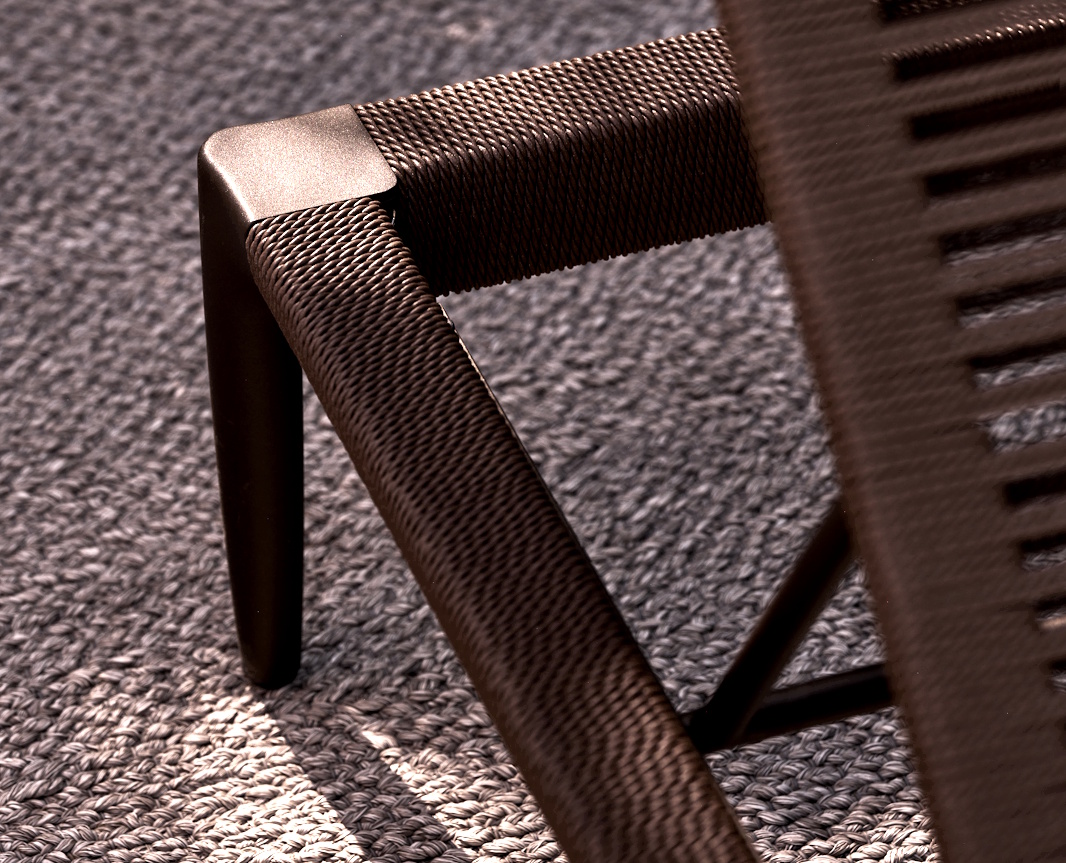 The backrest adjusts smoothly and effortlessly, while the cast aluminium frame is available with fixed legs, wheels, or stackable legs with wheels, all detachable for easy storage and transport. Offered in two refined colour combinations of frame and weaving, Nagomi truly reflects a 360° approach to craftsmanship. Every curve and detail invites touch, creating a serene, harmonious retreat.