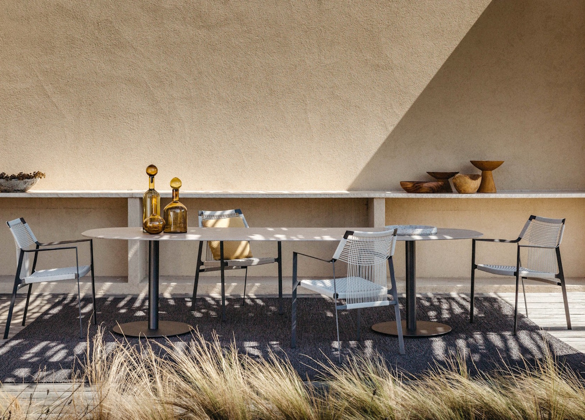 The Tribu Nodi garden armchair is light and comfortable with a seat & backrest hand woven in stain repellent, frost, UV & fungi resistant Canax rope which is stretched across a powder-coated stainless steel frame. The slim profile of the arm is angled slightly inward in a welcoming gesture.