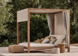 Teak frame, back and ceiling in either Oyster, Nature Grey or Stone Sunscape. Optional cushions and side curtains.