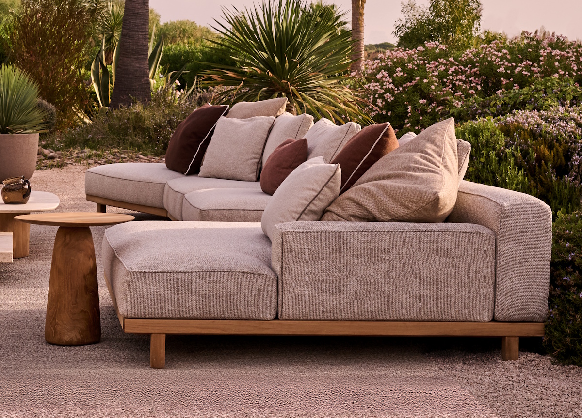 To upgrade the collection it has been reimagined with softer, more voluminous cushions, all outlined by signature piping that lends a discreet graphic rhythm. Each module sits on a slender, sustainable teak platform with deep comfortable cushions supported by invisible stainless steel brackets & it is also possible to attach practical coffee tables with either a teak, or natural Travertine Stone table top.