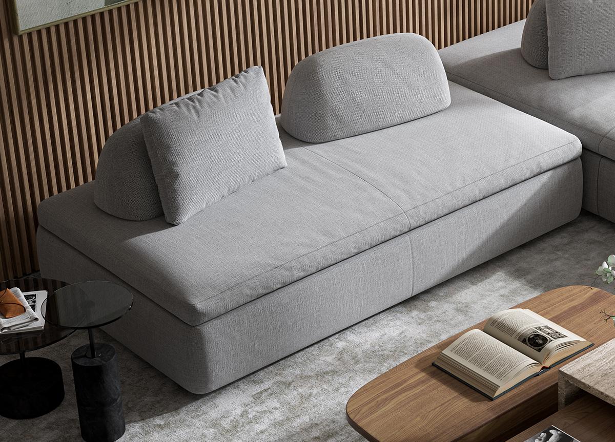 The sofa is available in two sizes, 198cm or 248cm (although this does not change the bed size). It does not have a back, instead the carefully designed back cushions (optional - one is shown wqith a scatter cushion, which is not included) provide support. It is also possible to buy an ottoman without the bed mechanism, to make a corner as shown here.
