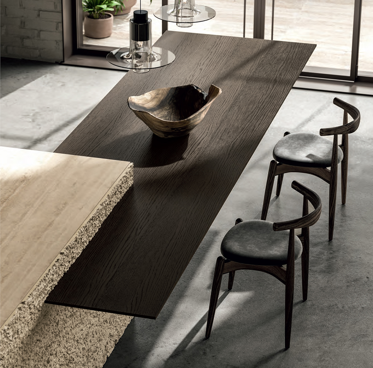 The Vitae kitchen perfectly demonstrates the artistry & breadth of Italian company The Cut, with an island clad on one side with rough Travertino marble, incorporating a table in dark grey oak. The cupboards behind are made in slatted matt lacquer, & the tops & side clad in smooth Travertino marble.