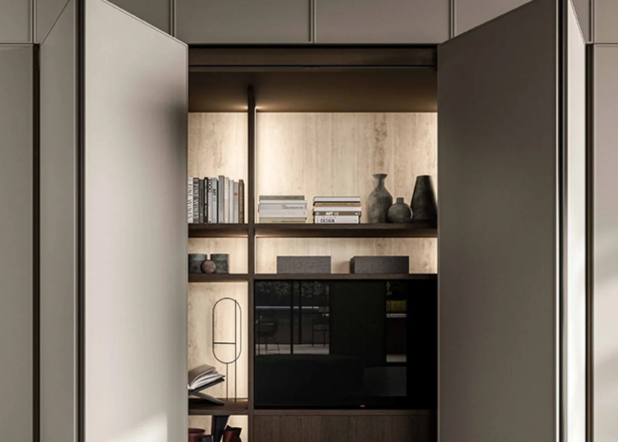 The tall cupboards have folding retracting doors, & internal cupboards illuminated with strategically placed LED strips.