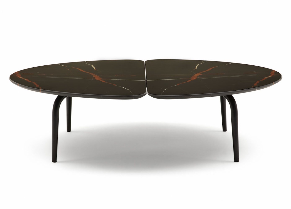 The table top is available in three marble finishes; Red Lepanto marble, Sahara Noir marble and Grey Calacatta marble. Base in black varnished steel.