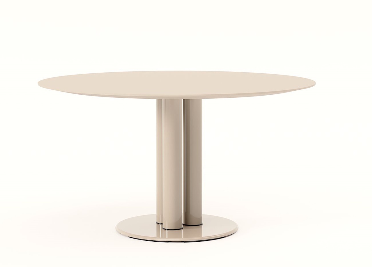Or finally you can opt for a table top in 30mm thick matt or glossy lacquered MDF wood in either talc, hemp, algae, amaranth and espresso with a polished lacquered steel base in a matching colour.