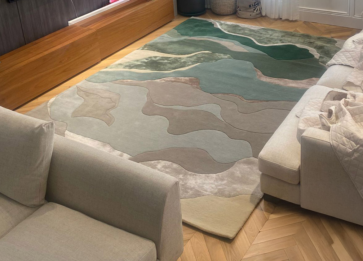 The Zena hand tufted rug in wool with viscose, with hand carving, was designed in collaboration with our client, who wanted specific colours, an exact size, & had a waved pattern in mind.